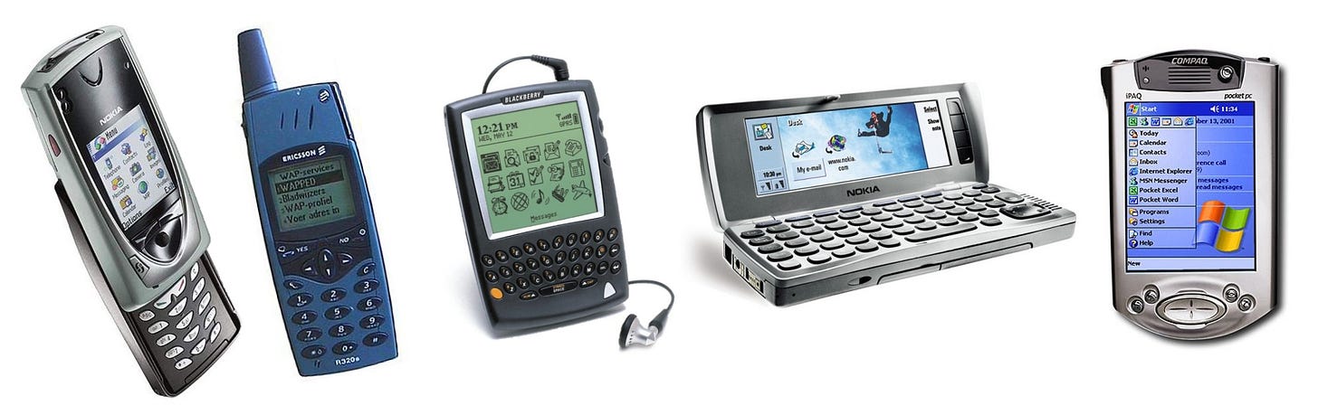 Example 2: When we analysed mobile computing also in the early 2000’s, we saw a collection of disconnected solutions: PDAs with styluses without internet connection, WAP phones with tiny screens and number pads, and smart phones with reasonably sized screens, but without touchscreens. None of them made it easy to access and interact with internet content in a direct, easy way when users were away from a desk.